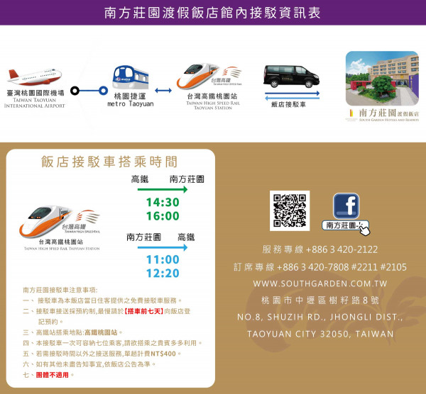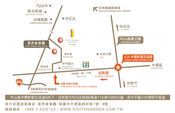 2017-10-031. 交通指引:中山高下中壢/新屋交流道,沿縣道114往西行,過中平國小,右轉直行即可抵達南方莊園渡假飯店。